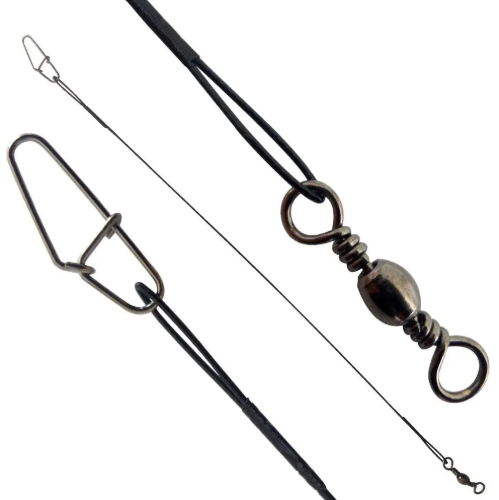 Chicote Leader Black de Aço é um cabo de aço com snap reforçado e girador, ideal para garantir que a linha não se rompa ao enroscar em troncos, pedras ou peixes com dentição muito afiada.